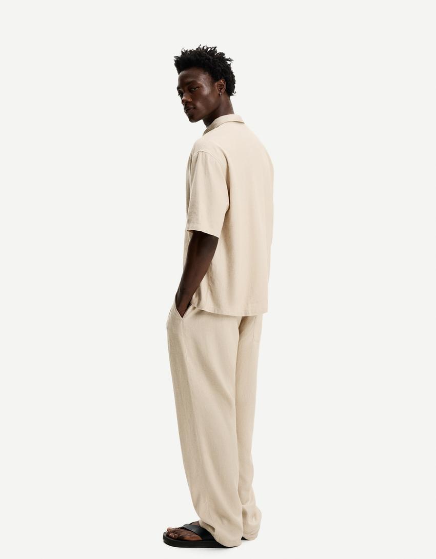 El tejido con lino aporta transpirabilidad y una textura natural, ideal para mantener una sensación de frescor durante todo el día. Su corte limpio y equilibrado favorece la silueta sin resultar ajustado, ofreciendo un ajuste cómodo y elegante.